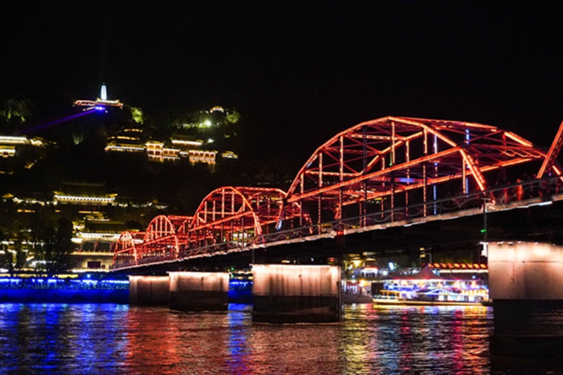 这是2024年4月26日在甘肃省兰州市城关区拍摄的兰州黄河铁桥中山桥夜景。新华社记者 马希平 摄